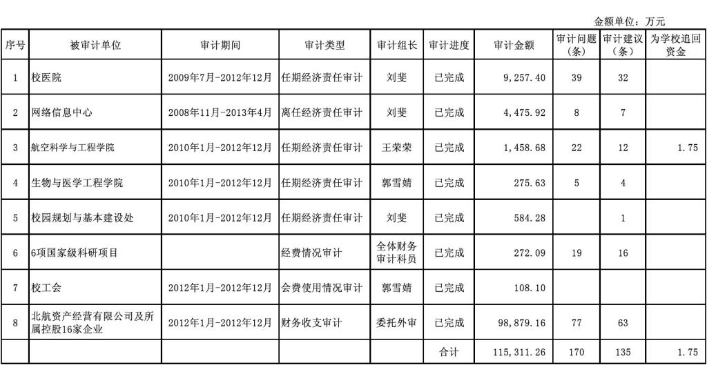 2013年,审计处共完成了8项财务审计项目(1项委托社会中介机构外审),审计金额共计115,311.26万元,查出审计问题170条,提出审计建议135条,为学校追回资金1.75万元。现公告如下: